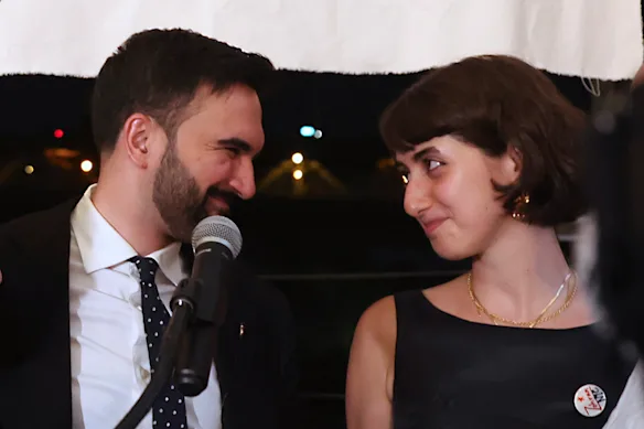 Mamdani no palco com sua esposa, Rama Duwaji, em sua festa nas eleições primárias em junho.Crédito: PA