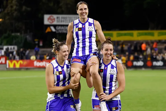 Jasmine Garner foi comandada em campo após sua 100ª partida pelas companheiras de equipe Kim Rennie (esquerda) e Emma King (direita).Crédito: Fotos de AFL