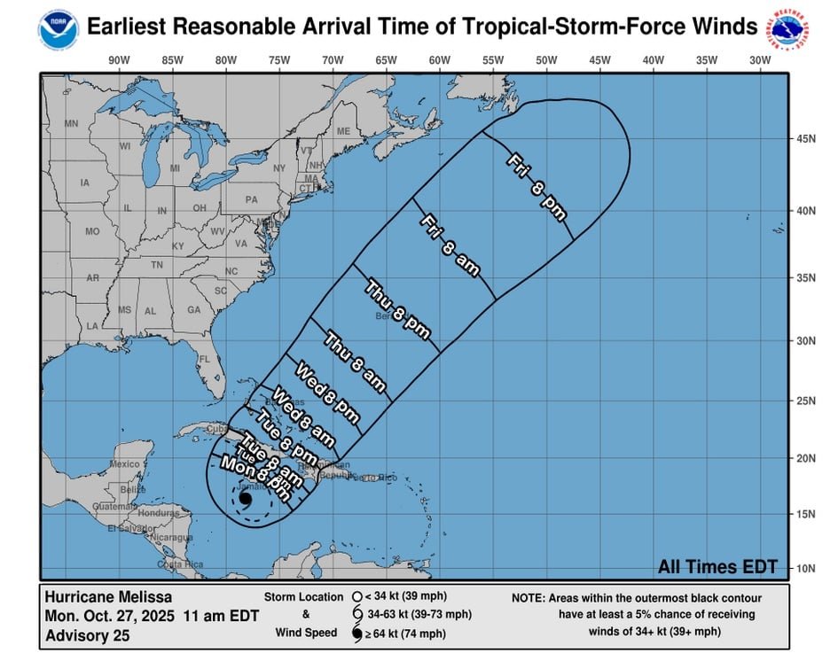 O Centro Nacional de Furacões (NHC) espera que Melissa chegue diretamente à Jamaica na manhã de terça-feira. A trajetória prevista para esta tempestade lenta mostra uma curva para nordeste à medida que rasteja sobre a ilha, atingindo Cuba novamente por volta das 2h (horário do leste dos EUA) de quarta-feira. Por volta das 14h daquele dia, Melissa deveria chegar ao arquipélago Lucayan – uma cadeia de ilhas que inclui as Bahamas e Turks e Caicos – fazendo seu terceiro desembarque em três dias.