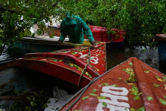 Um pescador amarra barcos em Old Harbour, Jamaica, na segunda-feira, em preparação para o furacão Melissa.Crédito: PA