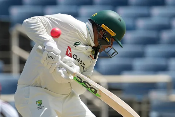 Usman Khawaja lutou na série contra as Índias Ocidentais e às vezes foi alvo de ataques curtos.Crédito: PA