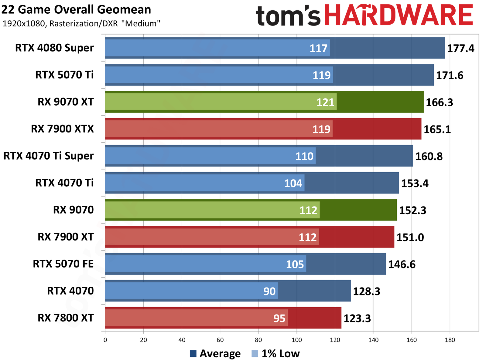 Em nossos testes, descobrimos que a GPU oferece uma excelente relação preço-desempenho, com desempenho quase tão bom quanto o RTX 5070 Ti da Nvidia, que atualmente custa mais de US$ 700. Comparado ao carro-chefe da geração anterior da AMD, o RX 7900 XTX, é apenas cerca de 5% mais lento em configurações 4K Ultra e apenas 3% mais lento em 1080p Médio. Ele também supera o RX 7900 XT em 5–10%, oferecendo desempenho superior ao de uma GPU de última geração lançada originalmente por US$ 750.