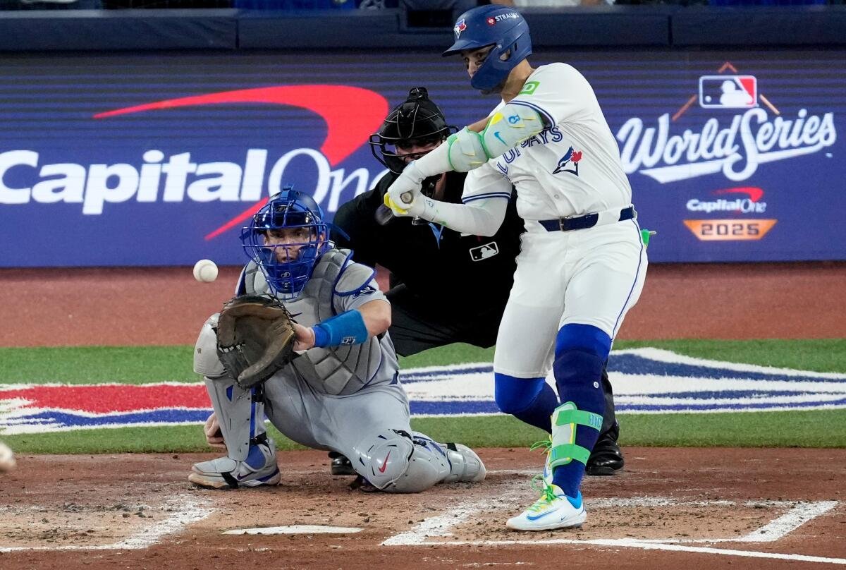 Bo Bichette, do Toronto Blue Jays, faz um home run de três corridas durante o jogo 7 da World Series, 1º de novembro de 2025, em Toronto.